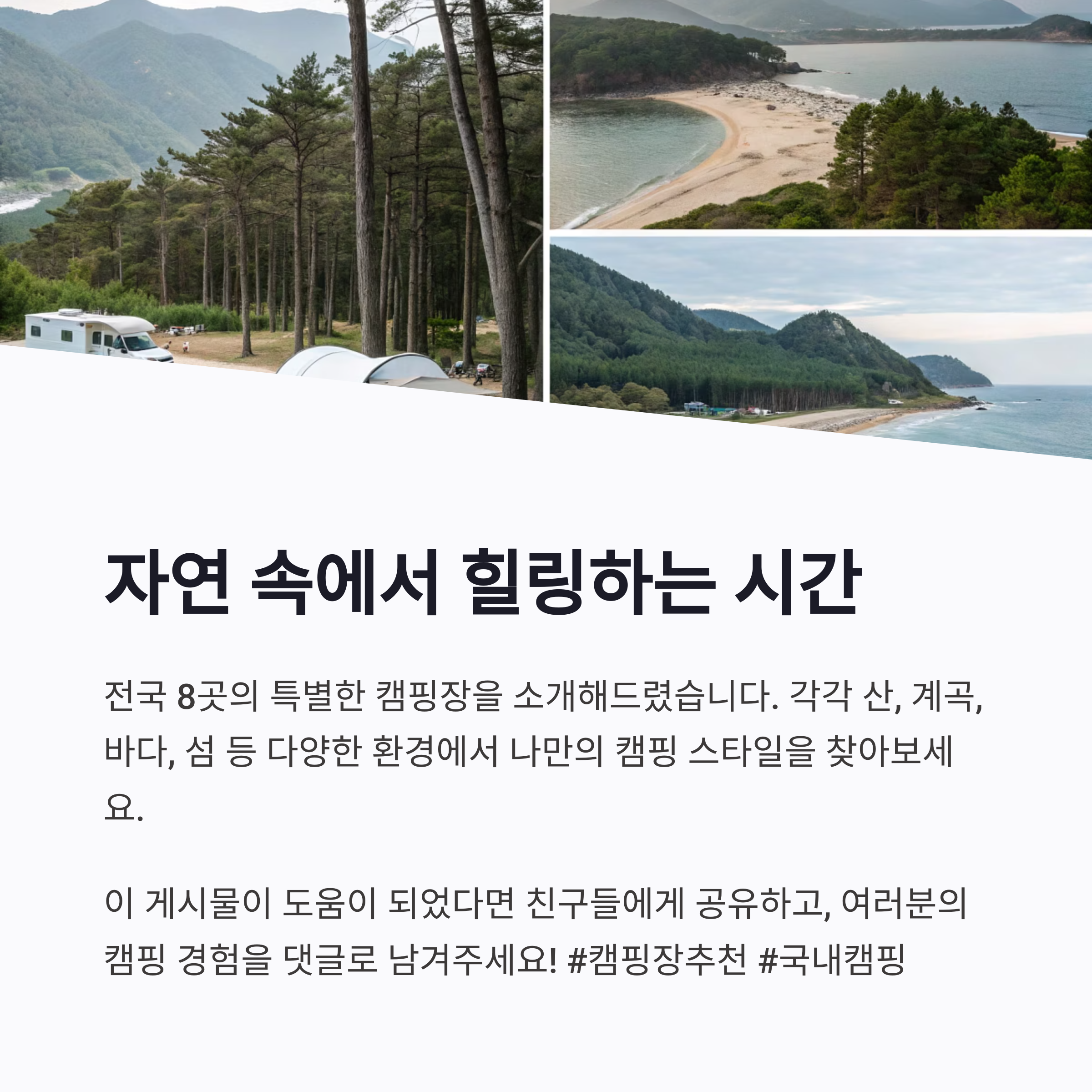 이번 글에서는 사계절 내내 즐길 수 있는 전국의 인기 캠핑장 8곳을 소개합니다. 초보 캠퍼부터 가족, 솔로 캠퍼까지 모두 만족할 수 있는 명소만 선별했습니다.