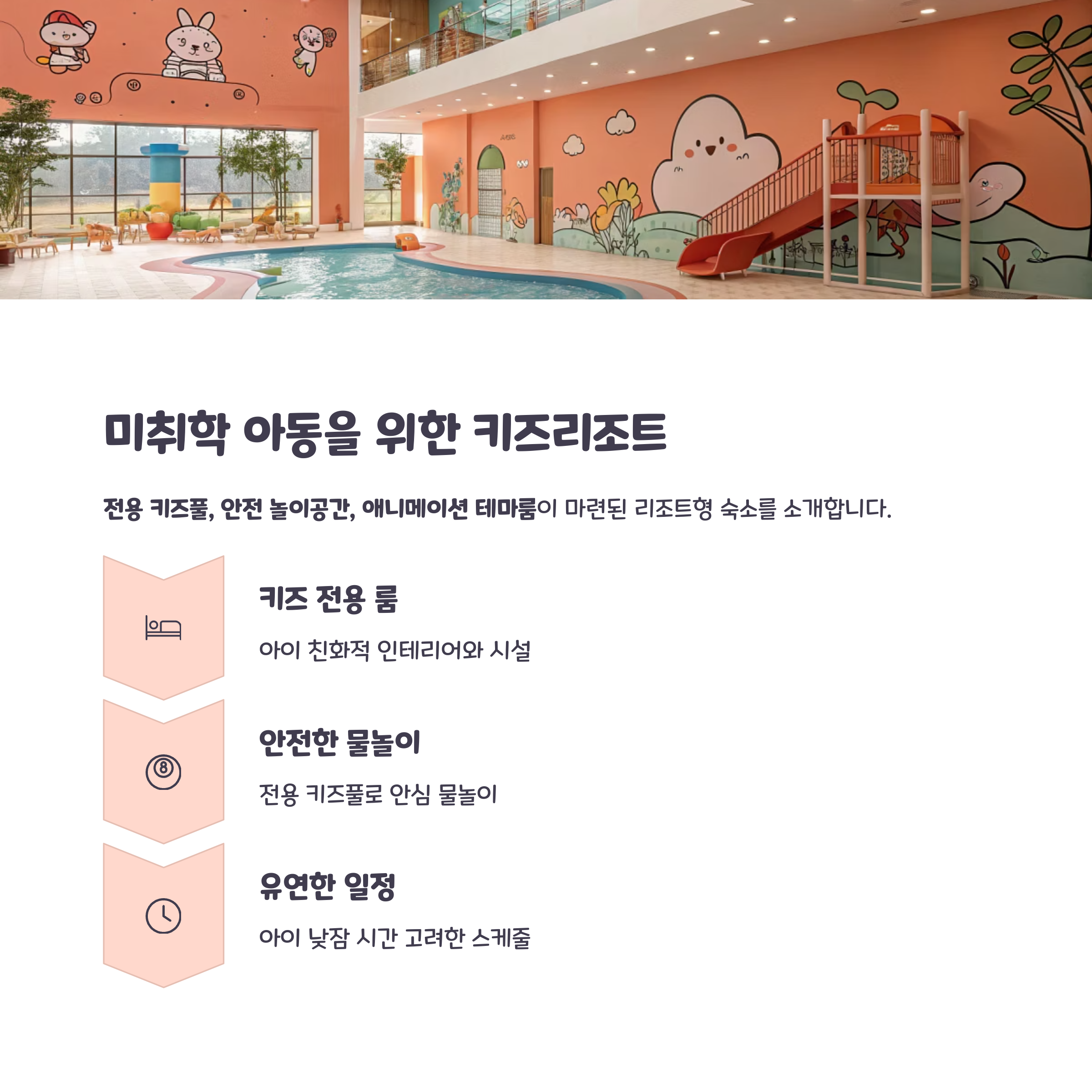 전용 키즈풀, 안전 놀이공간, 애니메이션 테마룸이 마련된